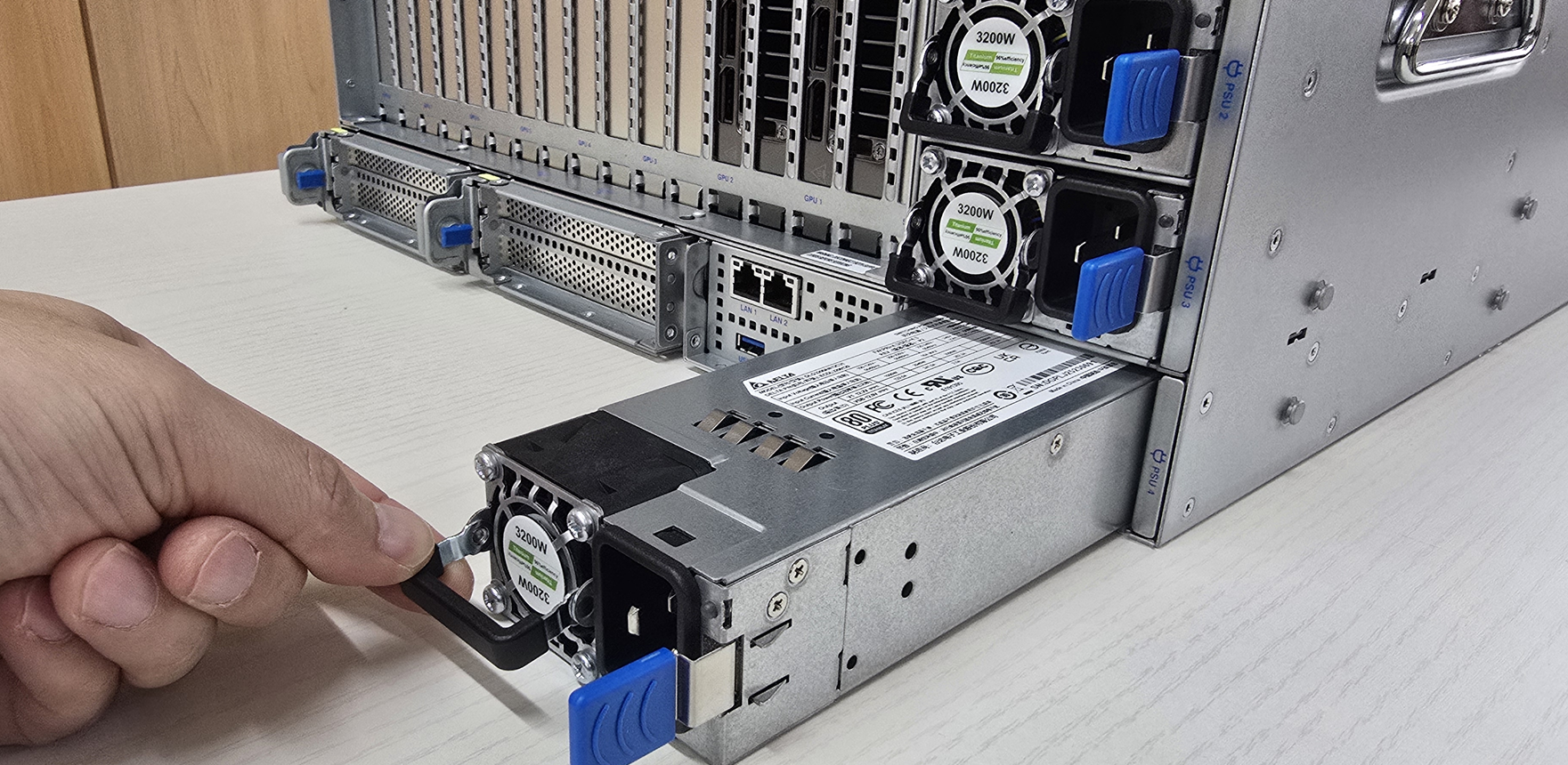 3200W 급의 PSU 가 3+1 방식으로 기본 동작해서 시스템 운영 중 1개의 PSU가 이상이 발생 해도 정상 가동되게끔 설계 되어 있습니다.