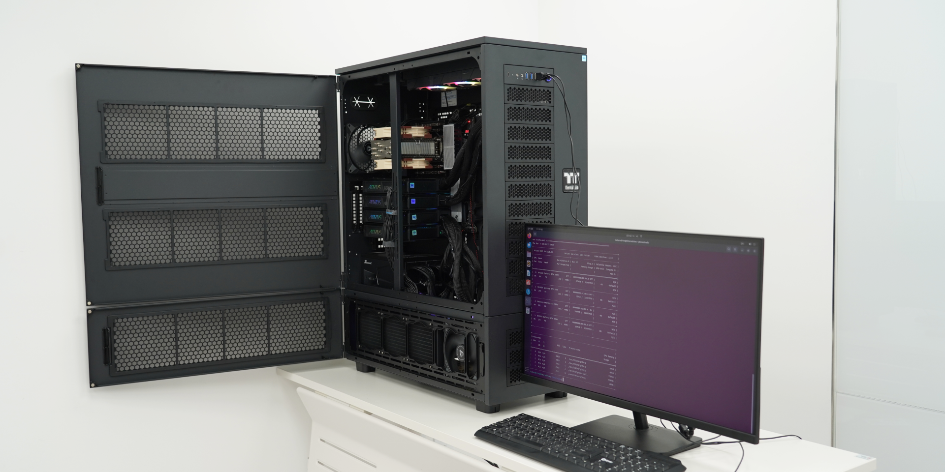이번 시스템은 RTX 5090 GPU 4개가 장착되는 구조를 기반으로 제작되었으며, 장시간 AI 연산 환경에서도 안정적인 성능을 유지할 수 있도록 GPU 수랭 쿨링 구조와 고효율 냉각 설계를 적용했습니다. 또한 내부 발열을 효과적으로 분산시키기 위해 다수의 저소음 팬을 활용해 공기 흐름을 최적화했으며, 장시간 풀로드 환경에서도 안정적으로 동작할 수 있도록 제작 단계에서 기본적인 안정성 테스트와 하드웨어 점검을 진행했습니다.